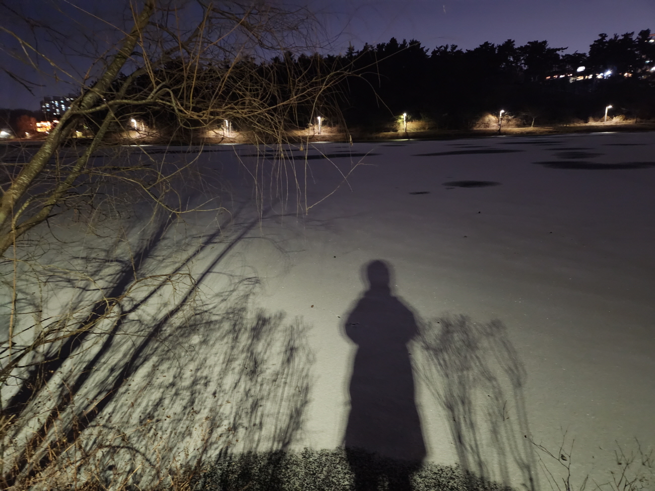 가로등을 배경으로 잠시 서 있노라니 내 그림자가 길게 누워있다.
